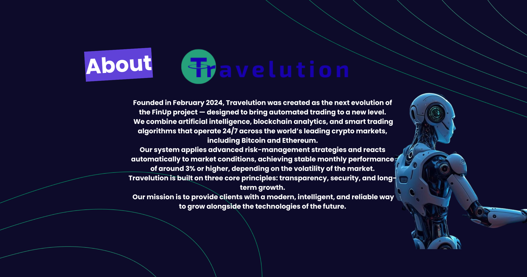 Crypto and Bitcoin are reshaping global wealth. Travelution combines artificial intelligence, automation, and data-driven trading to create a new era of financial growth — generating sustainable cash flow and long-term value for every investor.